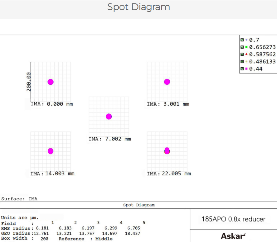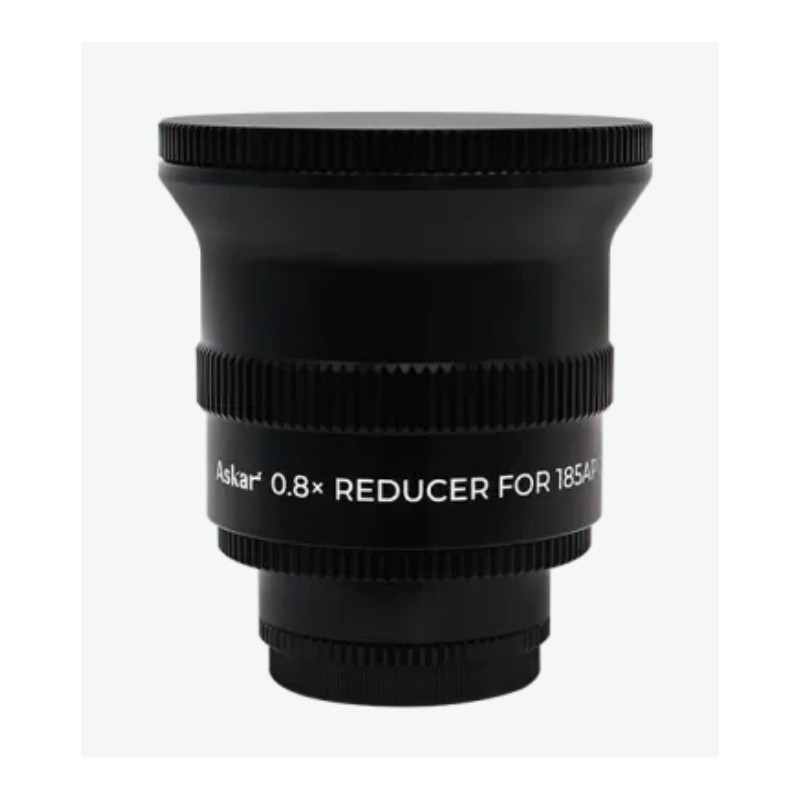 0.8x full frame reducer optimized for the Askar 185APO. It reduces the focal ratio to f/5.6 while providing built-in field correction. Designed for wide-field astrophotography, it supports a 44 mm image circle, standard 55 mm back focus, and direct 2 inch filter use.