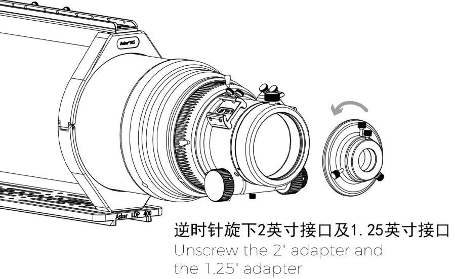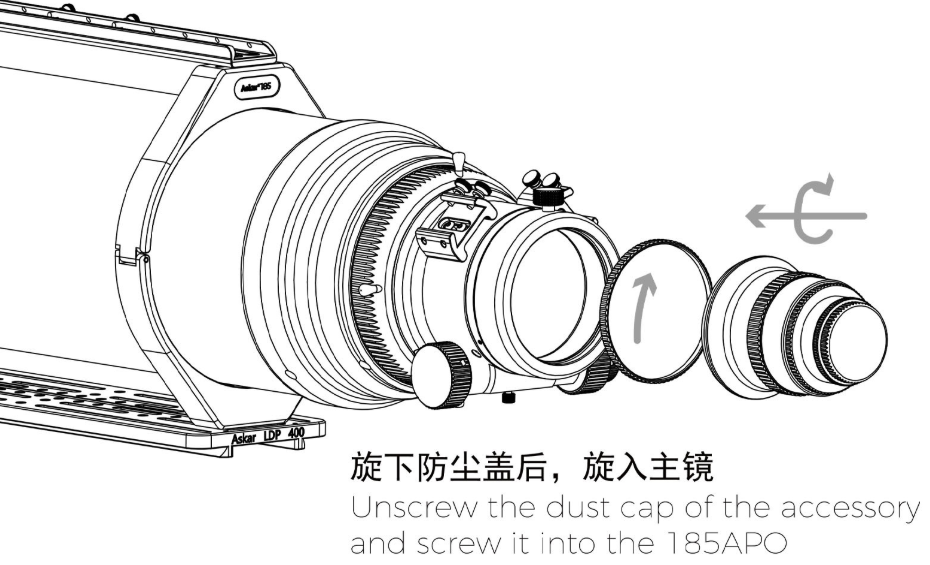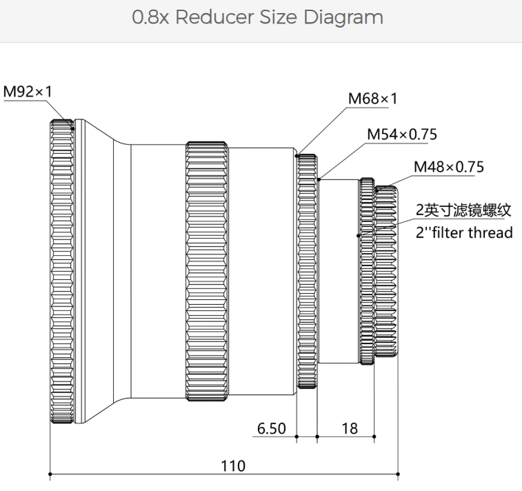 The Askar 0.8x reducer for the 185APO is a premium optical accessory specifically optimized for this refractor. It reduces the focal length to 1036 mm and the focal ratio to f/5.6 while maintaining integrated field flattening. Its quadruplet optical design ensures excellent aberration control across a full frame 44 mm image circle. The standard 55 mm back focus from the M48 thread allows easy camera integration. It features an M92x1 front thread, M68, M54 and M48 adapters, and a built-in M48x0.75 filter thread for direct 2 inch filter installation. The reducer is fully CNC machined and supplied with threaded metal caps for protection.