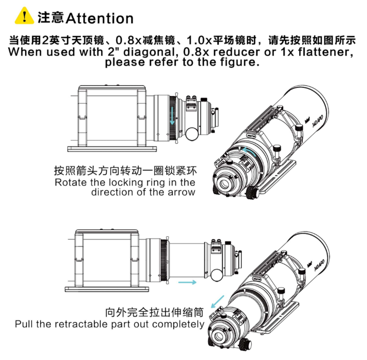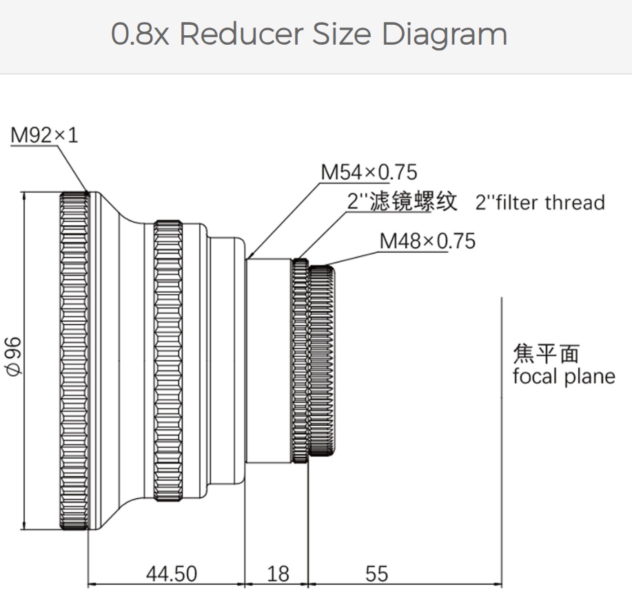 The Askar 0.8x reducer for the 140APO is an optical accessory specifically engineered to enhance the imaging performance of the Askar 140APO refractor. Once installed, it reduces the focal length to 784 mm and the focal ratio to f/5.6, delivering a wider field of view and shorter exposure times, ideal for large nebulae, star clusters and faint deep-sky objects. Its triplet optical design provides a corrected image circle covering full-frame sensors up to 44 mm. The reducer features a standard 55 mm back focus measured from the base of the M48 male thread. The front thread is M92x1. Camera-side adapters M54x0.75 and M48x0.75 are supplied, with the M48 adapter incorporating an internal 2-inch filter thread. The entire assembly is CNC machined and supplied with threaded metal dust caps to protect the optics when not in use.
