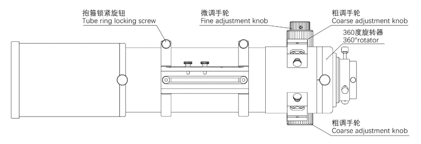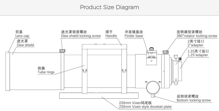 The 3-inch dual-speed rack-and-pinion focuser offers 1:10 fine adjustment and a 360° scale rotator for precise angle framing. The 230 mm Vixen dovetail plate includes 1/4" and 3/8" threaded holes for direct tripod mounting.