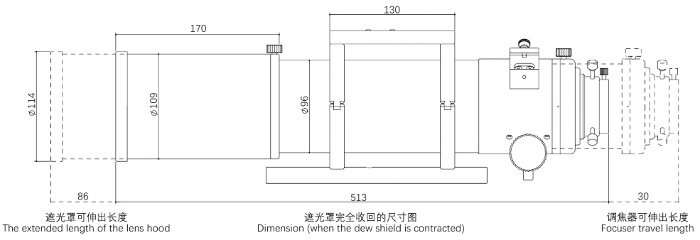 The retractable dew shield reduces overall length, while internal matting felt minimizes stray light. The blue-and-white CNC-machined tube ensures a refined appearance.
