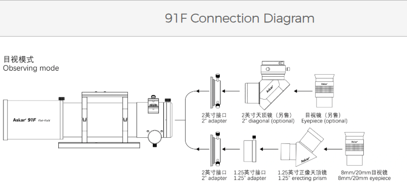 Weighing 3.92 kg (4.52 kg including rings and dovetail), the 91F provides a balance of portability and performance. It is suitable for both visual observation and astrophotography and includes three visual accessories: an 8 mm eyepiece, a 20 mm eyepiece and a 1.25" erecting prism. The eyepieces provide 76× and 30× magnifications and include rubber eye guards.
