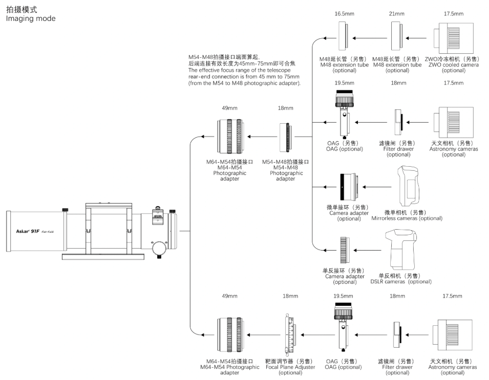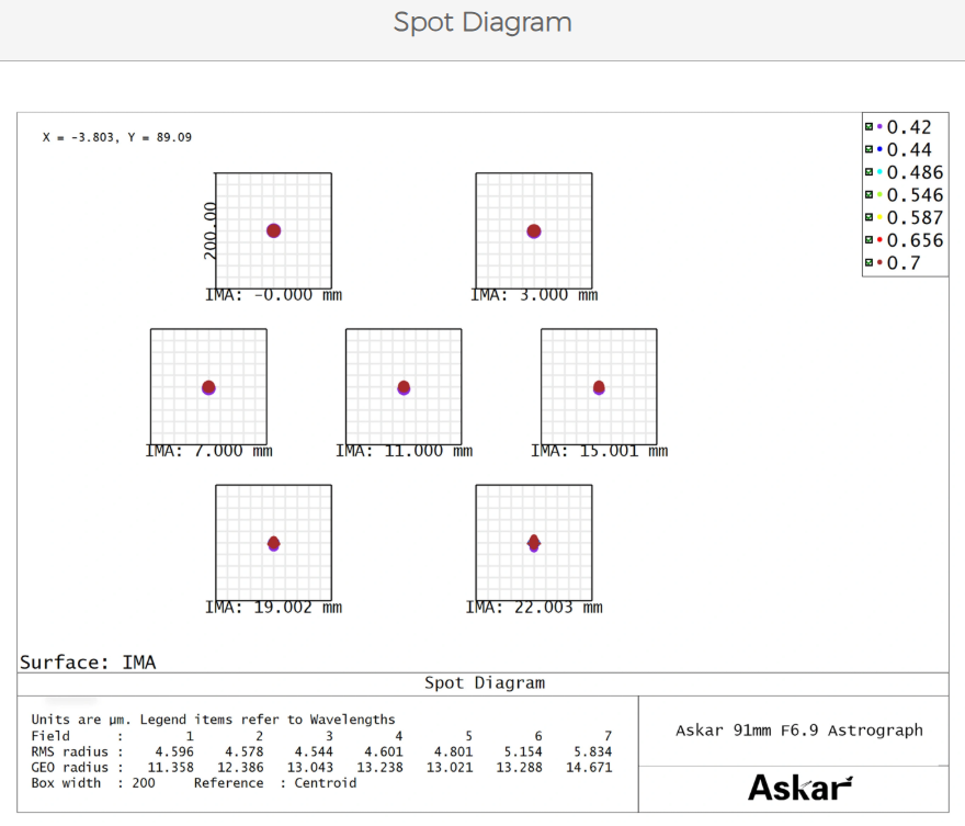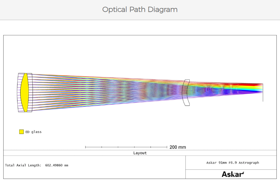 The Askar 91F features a quadruplet APO optical structure with three front elements and one rear element, including one ED glass element for effective chromatic aberration reduction. It has a 91 mm aperture, a 609 mm focal length and a native f/6.7 focal ratio. It supports a 44 mm full-frame image circle with excellent edge-of-field star performance.