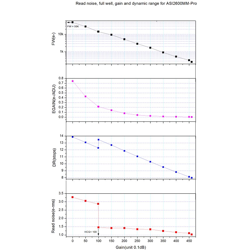 The ASI2600MM/MC Pro achieves a dynamic range of up to 14 stops. When the gain setting reaches 100, the HCG (High Conversion Gain) mode is automatically enabled, which substantially reduces readout noise while preserving dynamic range. For optimal deep-sky imaging performance, a gain setting of 0 or 100 is recommended.