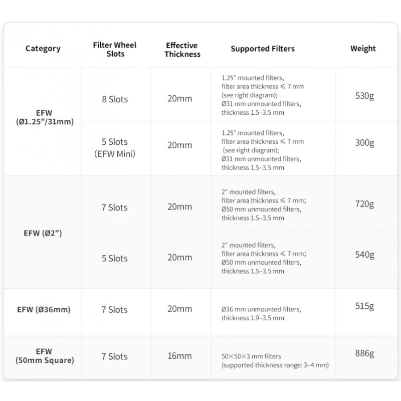 This model supports seven mounted 2 inch filters. The body is built from CNC-machined aluminum alloy to provide a compact, rigid, and durable structure. The internal filter carousel is made from 6061 aluminum alloy to ensure stable and reliable rotation.