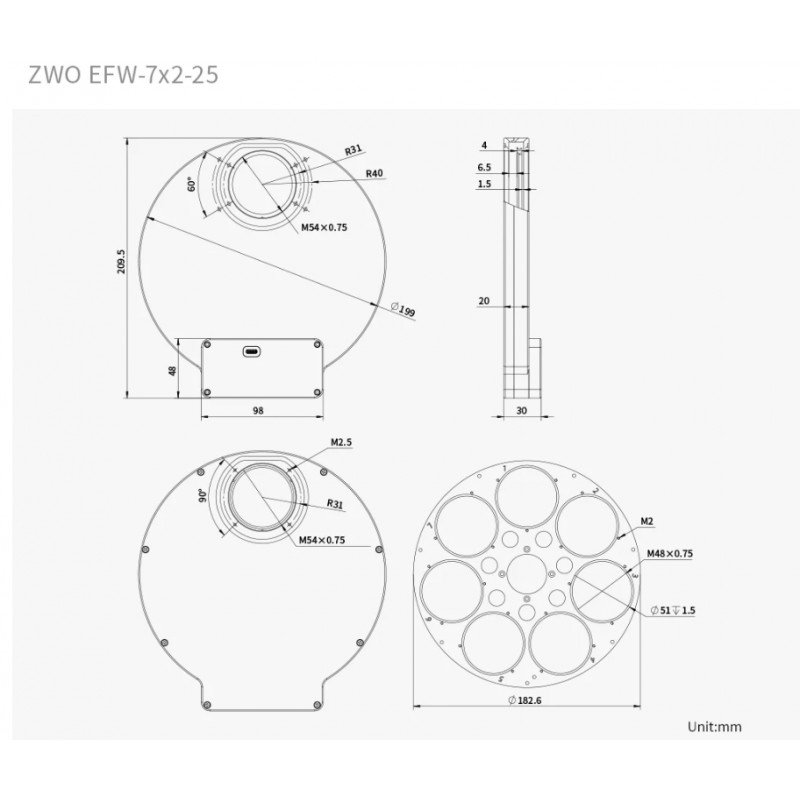 The ZWO EFW 7x2-25 is part of the next-generation ZWO electronic filter wheels, developed for modern astrophotography workflows. Its internal design has been refined to minimize stray light, which is critical for deep-sky imaging and long-exposure sessions.