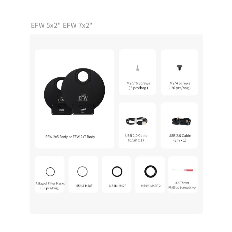 The ZWO EFW 7x2-25 is an electronic filter wheel designed for astrophotography. It supports seven mounted 2 inch filters and features a redesigned internal structure to reduce light leaks. Powered via USB, it offers smooth rotation, a CNC-machined aluminum body, and full compatibility with ASIAIR, ASIStudio, ASCOM, and the ZWO SDK.