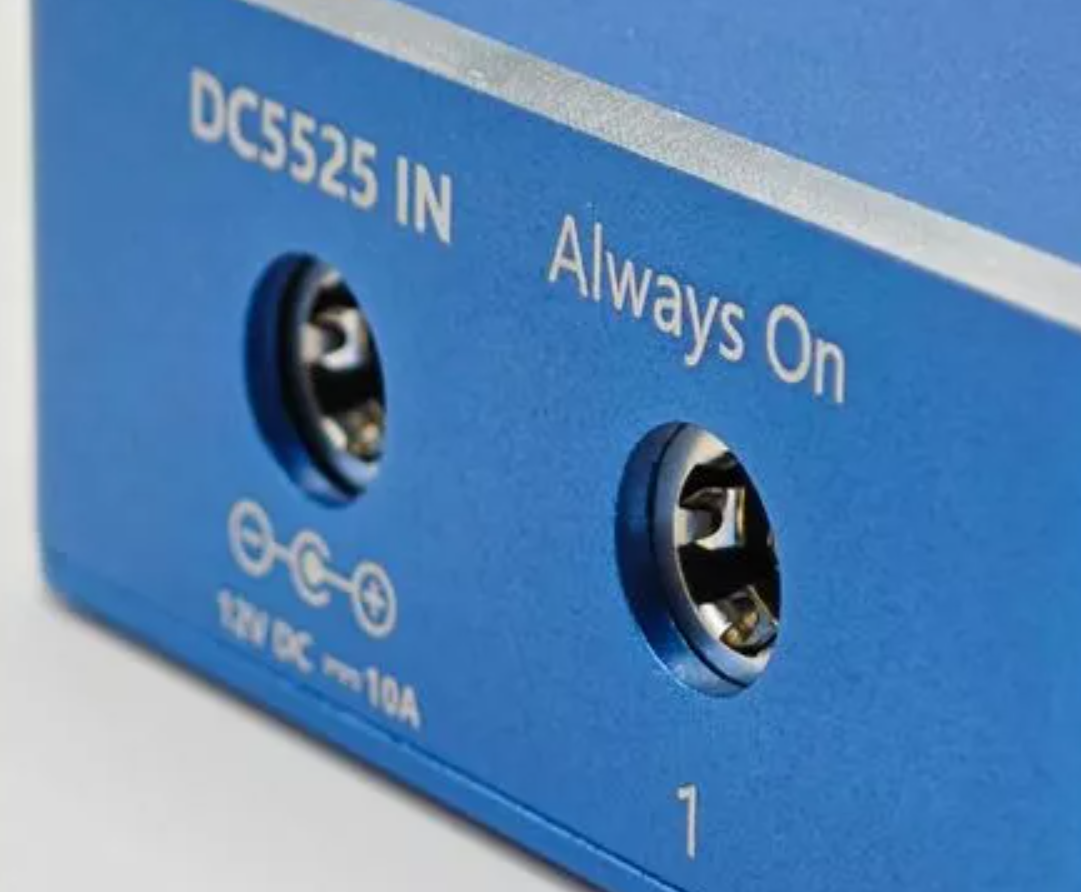 The main DC5525 input supports up to 12 V / 10 A and includes: