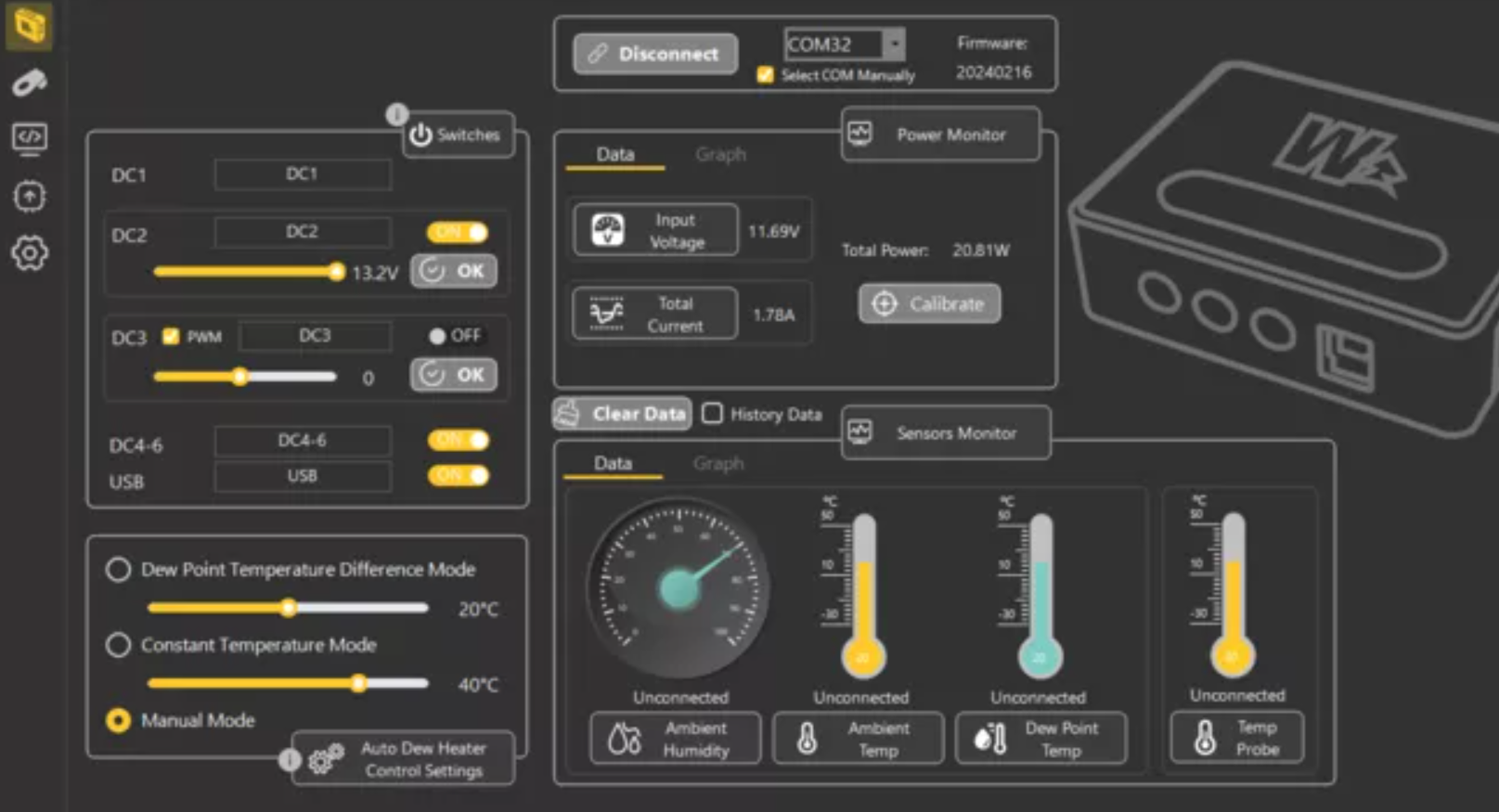 A monitoring interface provides live readings of voltage, current, temperature, and dew point.