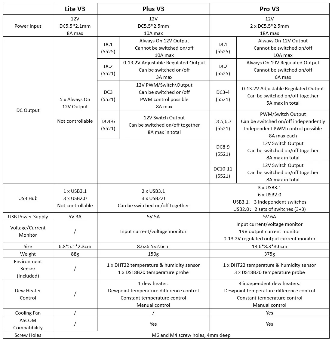 The WandererBox PLUS V3 manages power and USB connections for astrophotography setups. It includes regulated DC outputs, USB3.0/USB2.0 ports, smart dew heater control, and full electronic protection.
