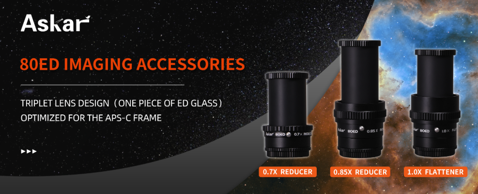 The Askar 80ED imaging accessories are specifically designed to enhance the astrophotography performance of the Askar 80ED refractor. Three dedicated options are available : a 0.7x reducer, a 0.85x reducer and a 1.0x flattener.