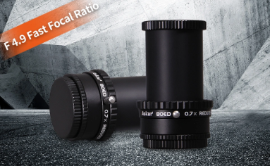 The 0.7x reducer lowers the focal ratio to f4.9 while providing field correction. Its triplet optical design with ED glass is optimized for APSC sensors, delivering a resulting focal length of 392 mm and enabling wider fields with shorter exposure times.
