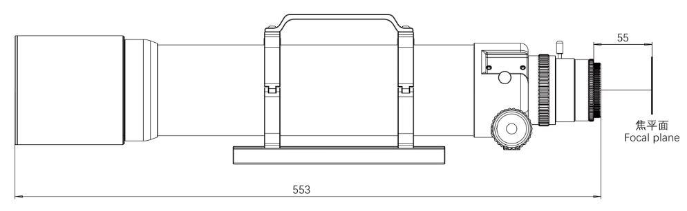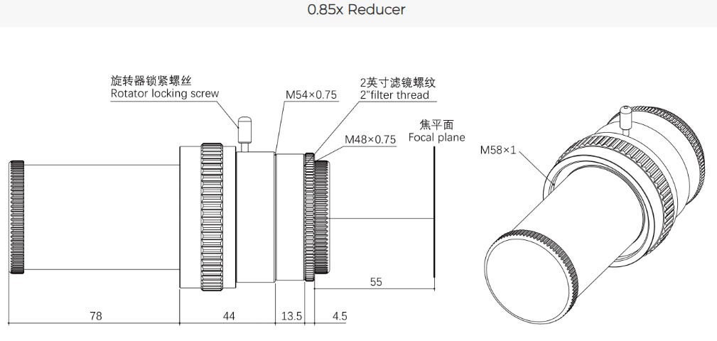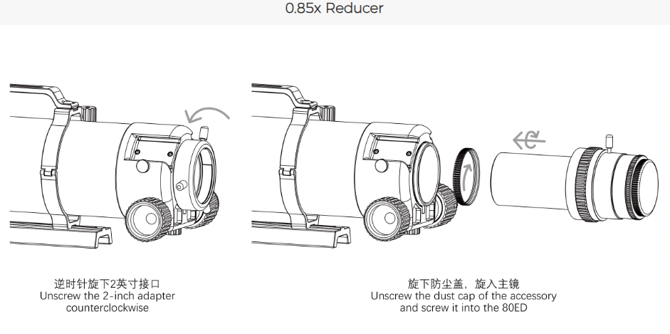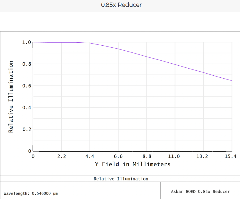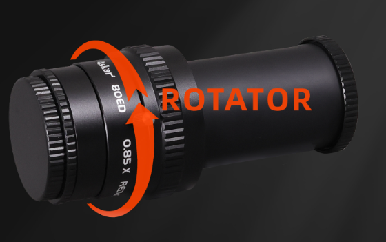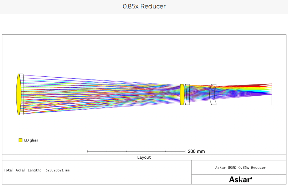The 0.85x reducer reduces the focal ratio to f5.9 and also includes field correction. Its triplet ED design is optimized for APSC imaging and results in a focal length of 476 mm, offering a balanced imaging configuration.