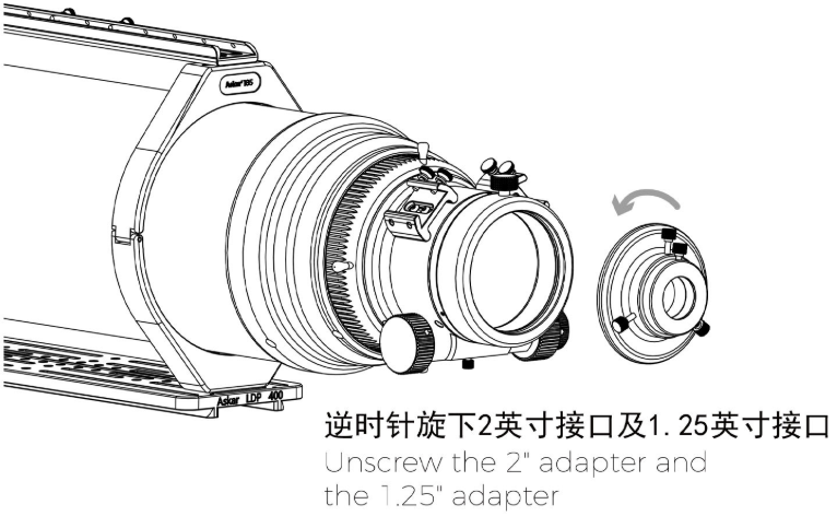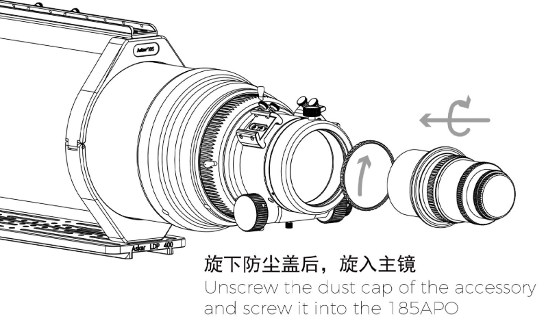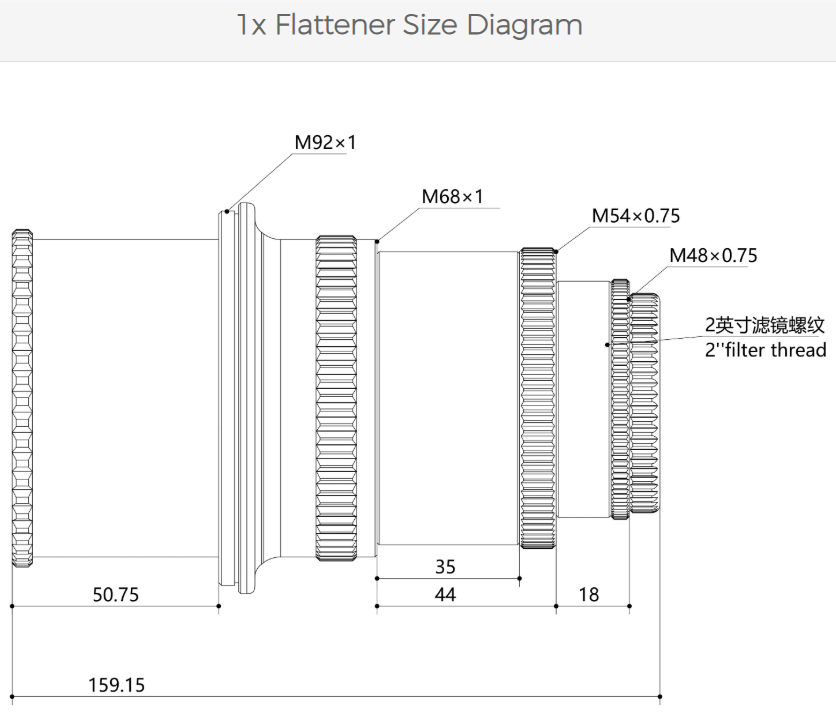 This flattener uses a triplet optical design and supports a 44 mm full-frame image circle. The standard back focus is 55 mm measured from the base of the M48 male thread. It features an M92×1 front thread and includes M68×1, M54×0.75, and M48×0.75 adapters for flexible imaging connections. A built-in M48×0.75 2-inch filter thread allows direct filter installation. The entire unit is CNC machined and equipped with threaded metal caps on both ends to prevent dust when not in use.