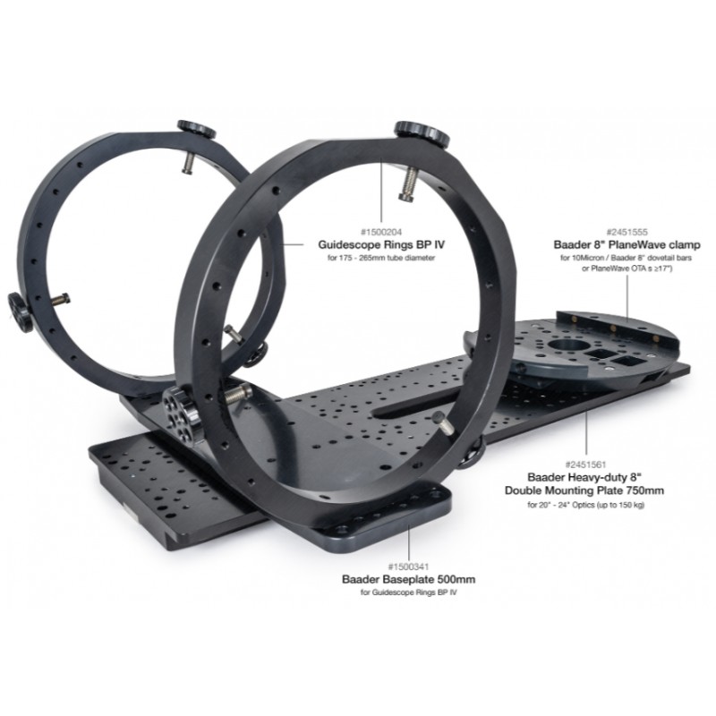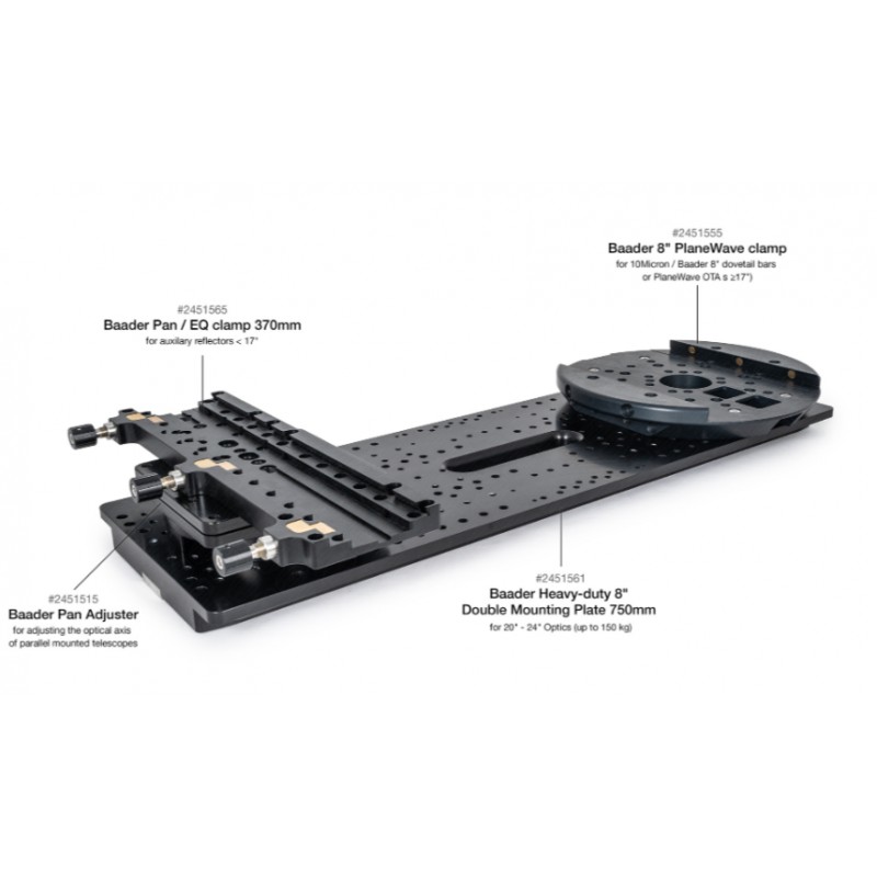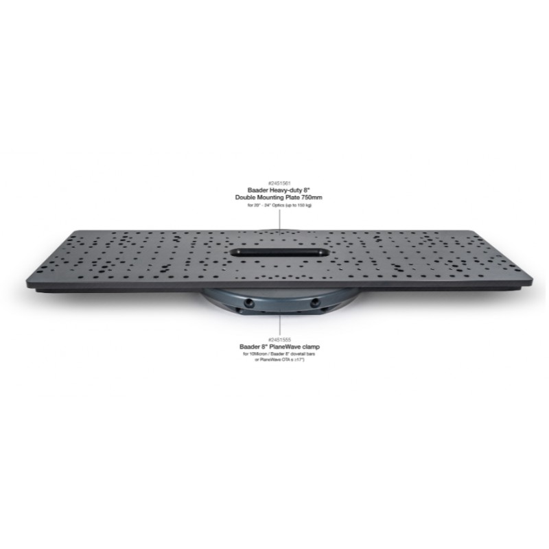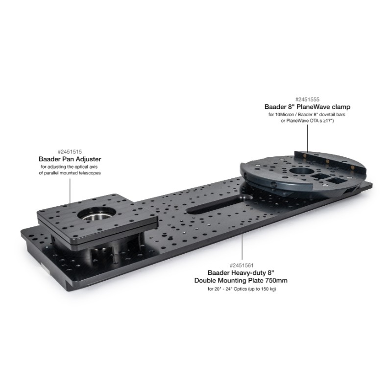 The Baader 8" heavy-duty double mounting plate is built for professional parallel telescope configurations, supporting a total payload of up to 150 kg. With a length of 750 mm and a width of 203 mm (8"), it is the ideal solution for mounting two large OTAs side by side—such as a PlaneWave DeltaRho 500 combined with another refractor or astrograph.