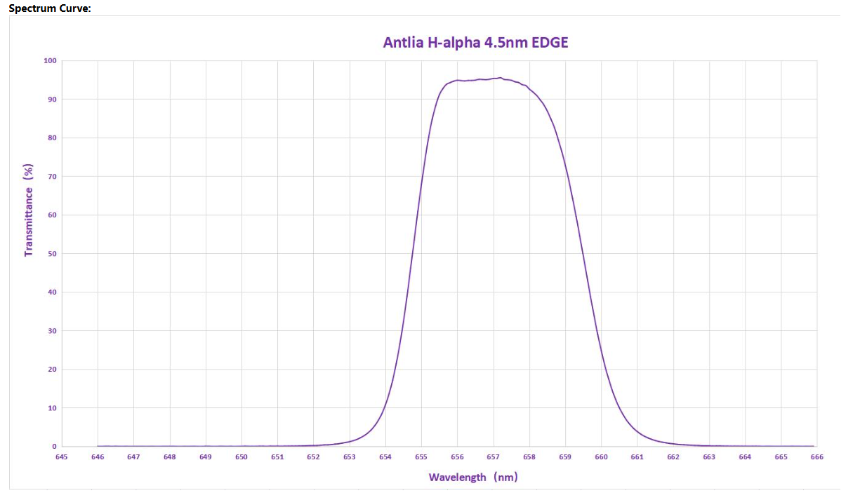 The Antlia H-alpha 4.5 nm EDGE filter is engineered for imaging deep-sky H-alpha emission nebulae at the 656.3 nm line. Its optimized spectral profile (4.5 nm FWHM) and OD5 out-of-band blocking deliver more than 90 % peak transmission and outstanding results even on fast optical systems down to f/3.