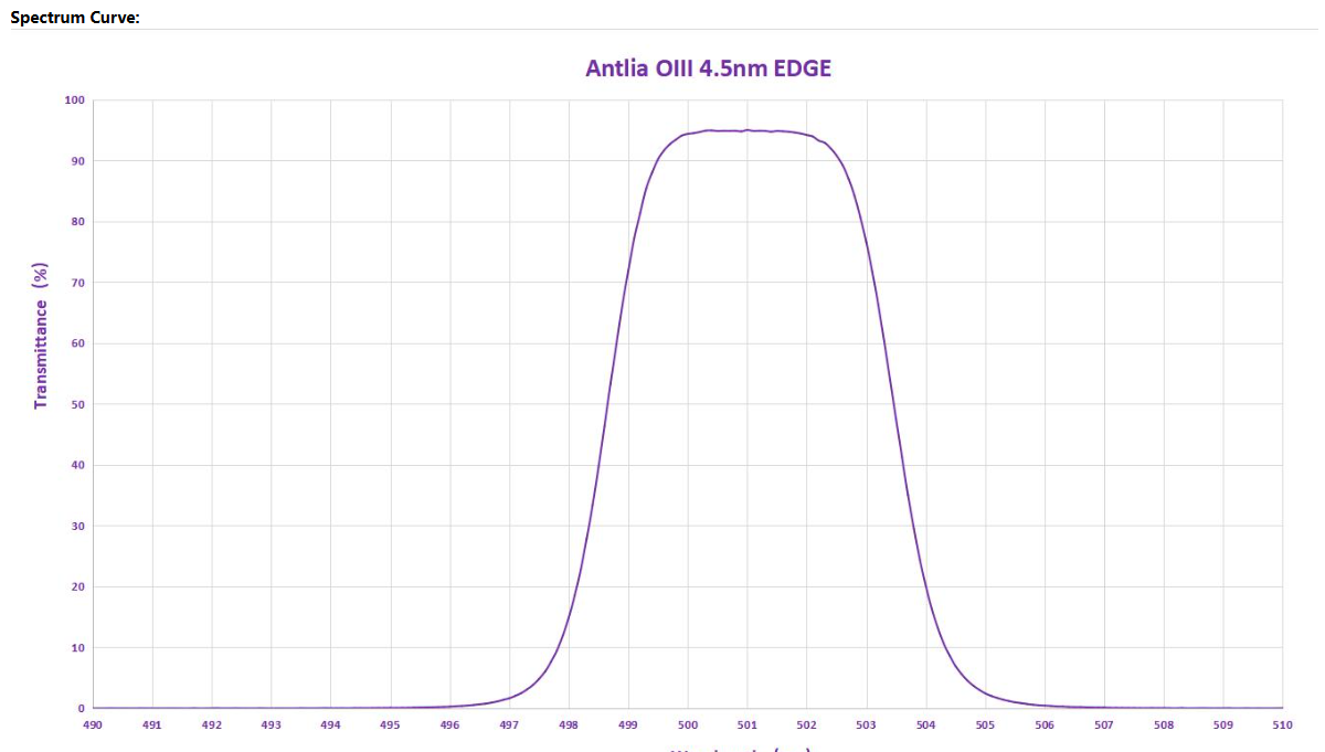 The Antlia OIII 4.5 nm EDGE filter is a narrowband filter designed for deep-sky imaging of nebulae emitting in the OIII line at 500.7 nm. Its 4.5 nm full width at half maximum and OD5 blocking eliminate unwanted wavelengths while maintaining more than 85 % peak transmission.