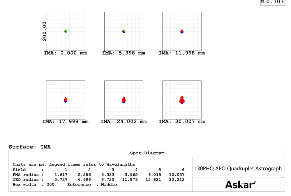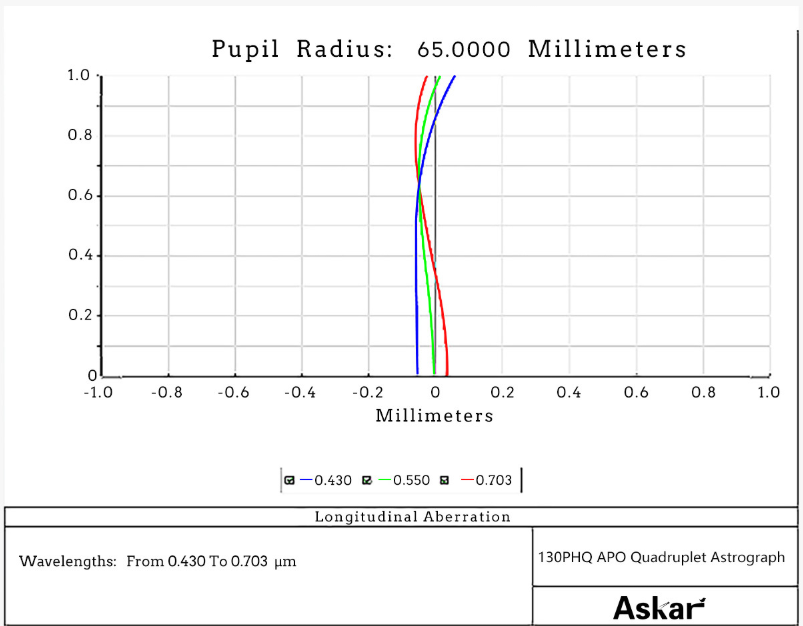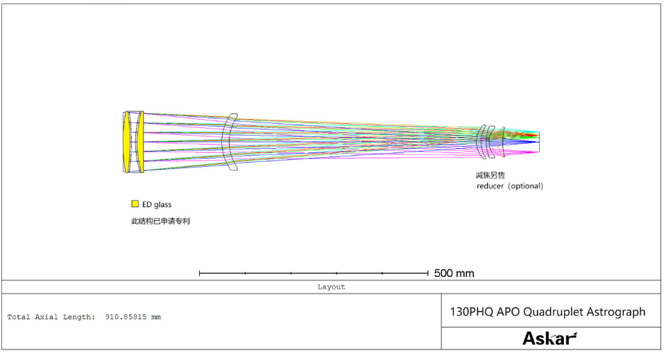 The 130PHQ is a long-focal astrograph optimized for direct imaging: no external corrector or spacing calculation required. With 1000 mm at f/7.7 and a quadruplet design using two ED elements, it supports a 60 mm image circle and maintains a central RMS below 2 microns.