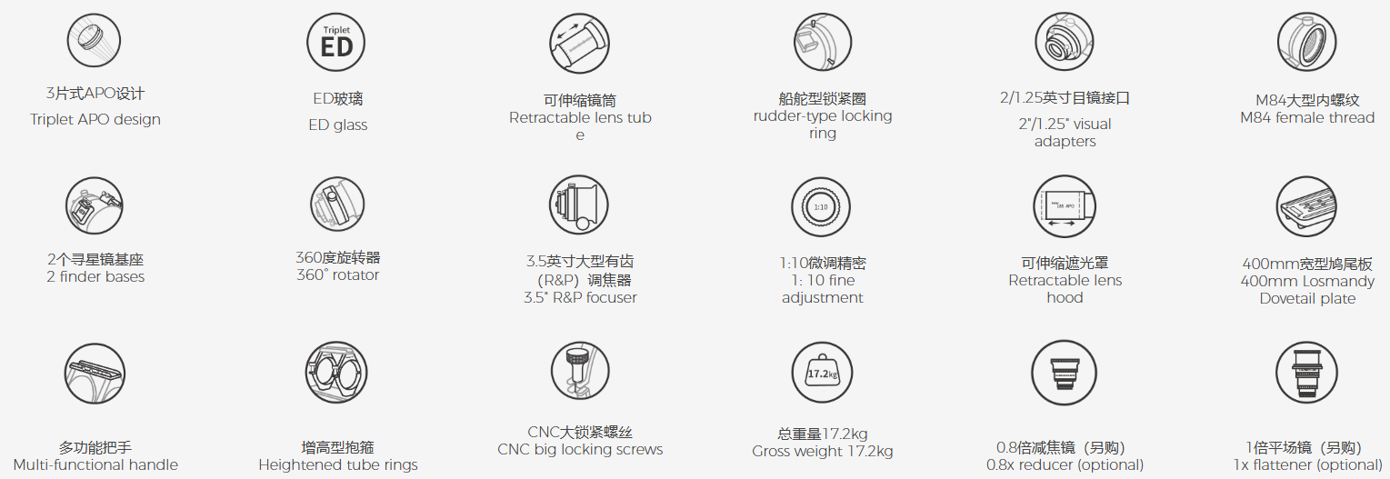 The Askar 185APO, as a large-aperture and long focal-ratio refractor, was designed with portability in mind. Thanks to its retractable optical tube, its minimum length is only 1081 mm, its net weight is 14.9 kg, and its total weight reaches 17.2 kg including the handle, tube rings and dovetail plate.