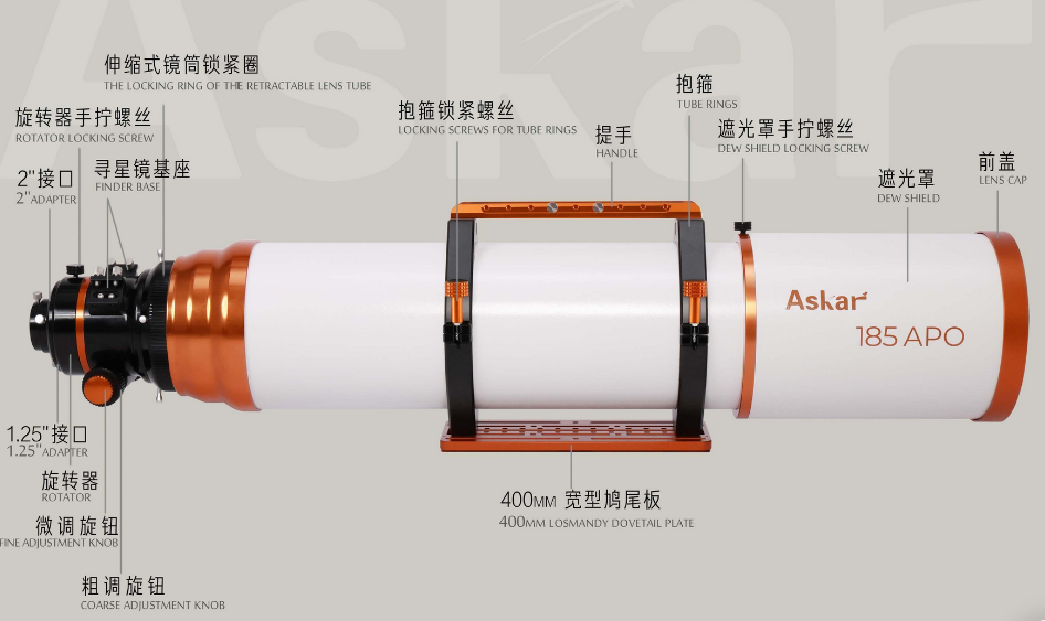 The entire tube of the Askar 185APO is manufactured using high-quality CNC machining, with anodizing and surface paint treatment. The orange accents on the ivory-white tube add a vivid and distinctive touch, giving it an elegant and refined appearance.