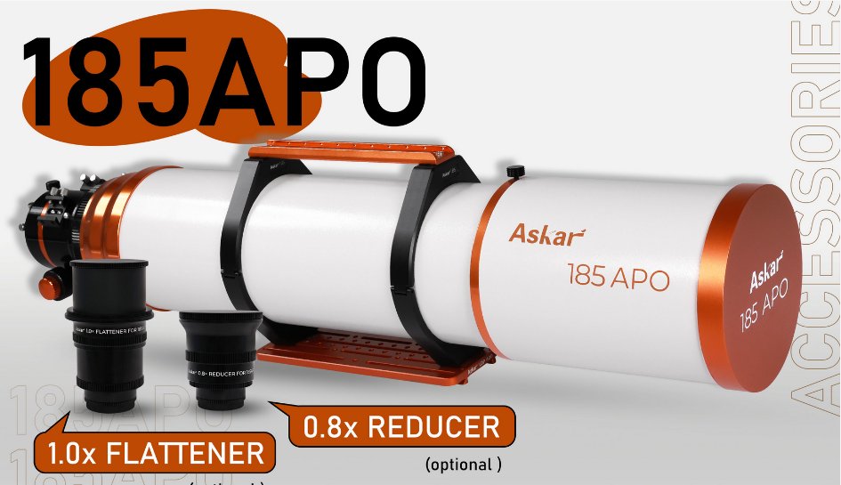 The Askar 185APO offers two optional accessories: a 1x flattener and a 0.8x reducer. Both accessories include a 2" filter thread for direct installation and come with M68/M54/M48 adapters to facilitate connection.