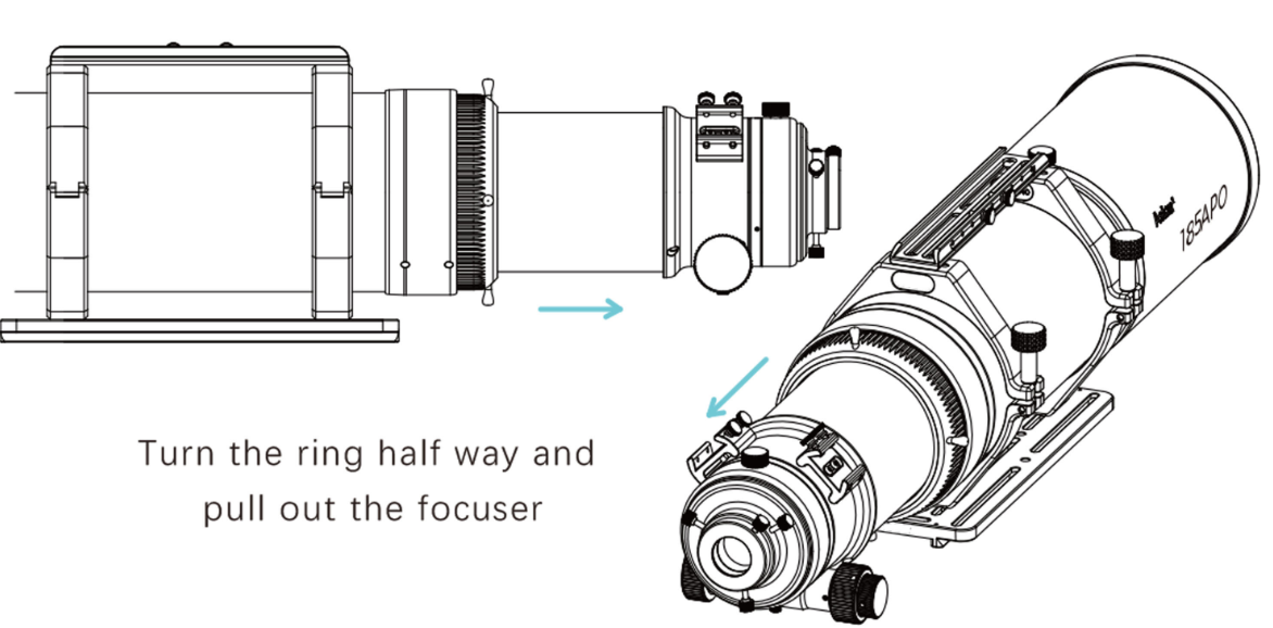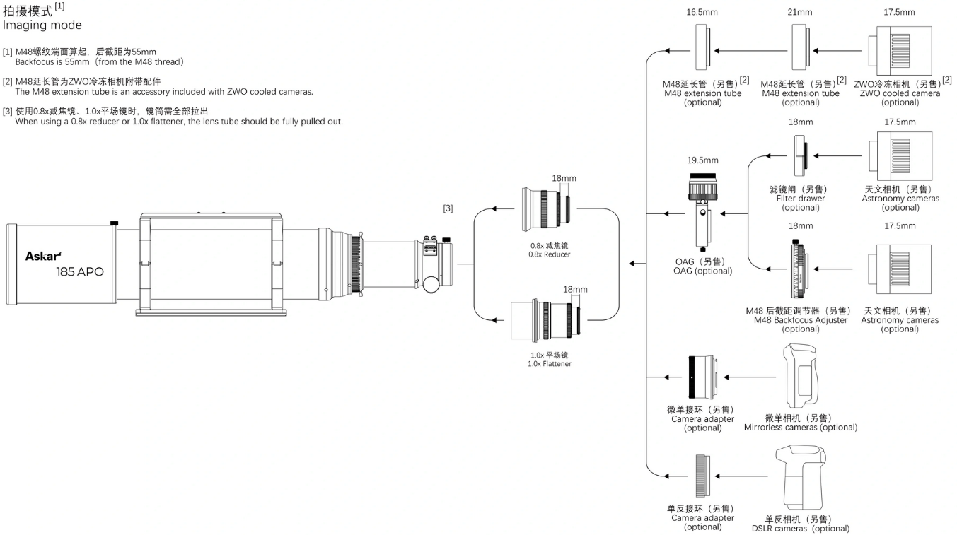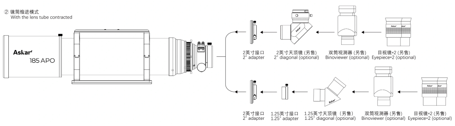 When the tube is retracted, the Askar 185APO can be used with a binoviewer for visual observation. When the tube is extended, the 185APO can be equipped with a 0.8x reducer or a 1.0x flattener for imaging, or with a diagonal and an eyepiece for observing.