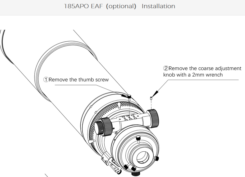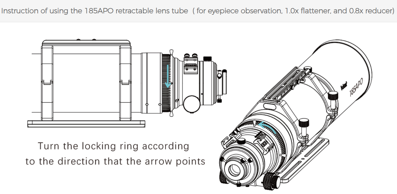 It is important to note that the rear tube of the Askar 185APO features an integrated retractable system. This design reinforces overall stability and ensures that the optical axis is not affected when the tube is extended, thus maintaining image quality. The retractable section also includes a rudder-type locking ring that makes tightening and loosening easy.