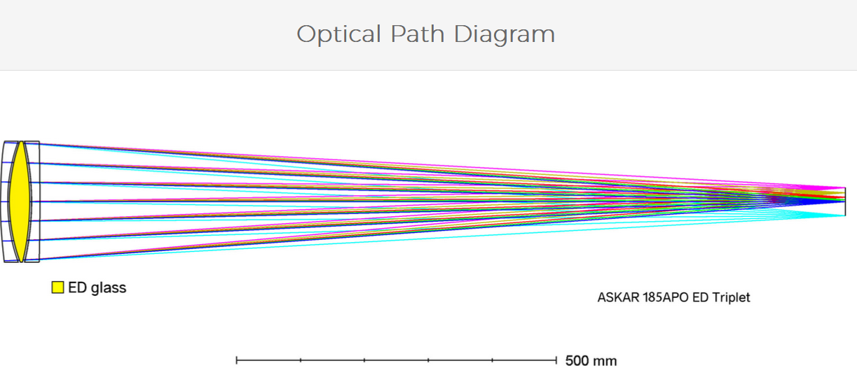 The Askar 185APO adopts an air-spaced APO triplet design that includes one low-dispersion glass element.