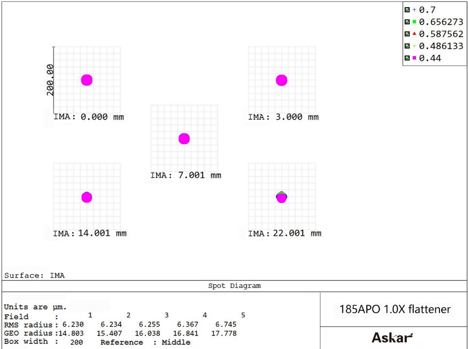 The 1x flattener does not change the telescope’s focal ratio. Once installed on the Askar 185APO, the focal ratio remains f/7. It corrects field curvature and coma, providing flatter field edges and finer star points.