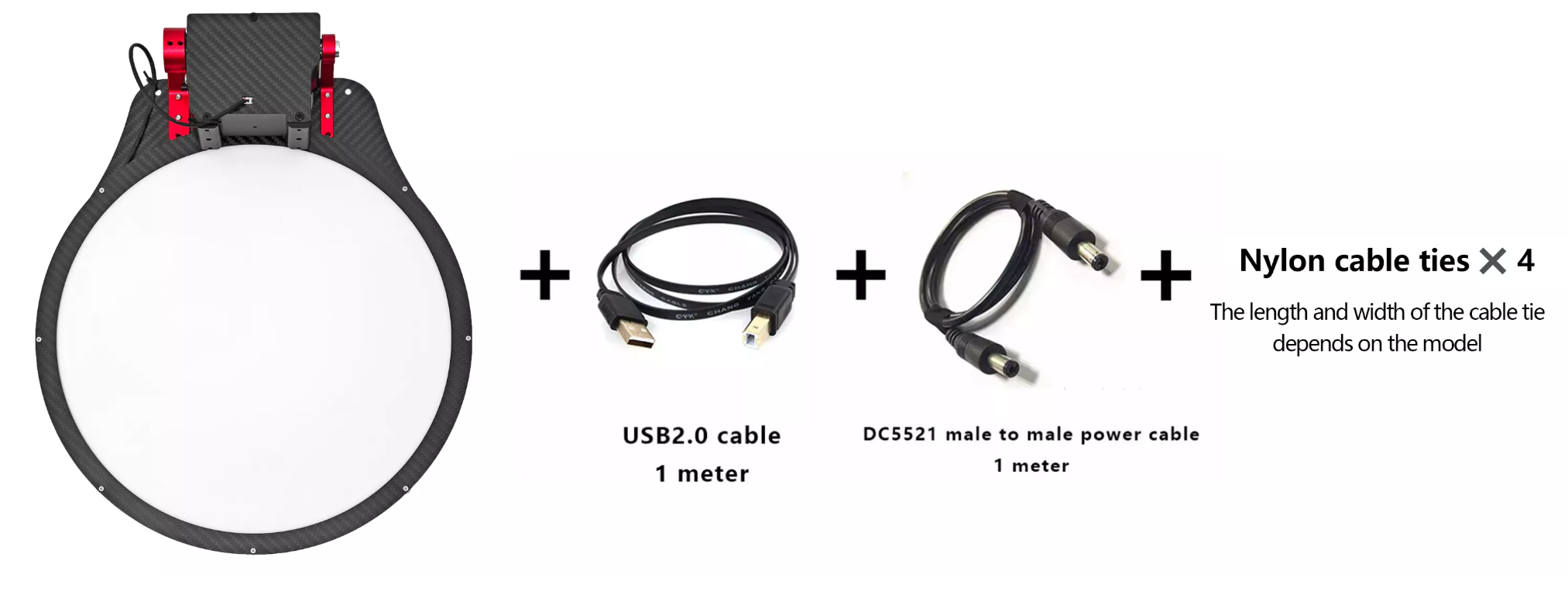 Included: 1 m USB cable, 1 m DC5521 power cable, 4 nylon ties