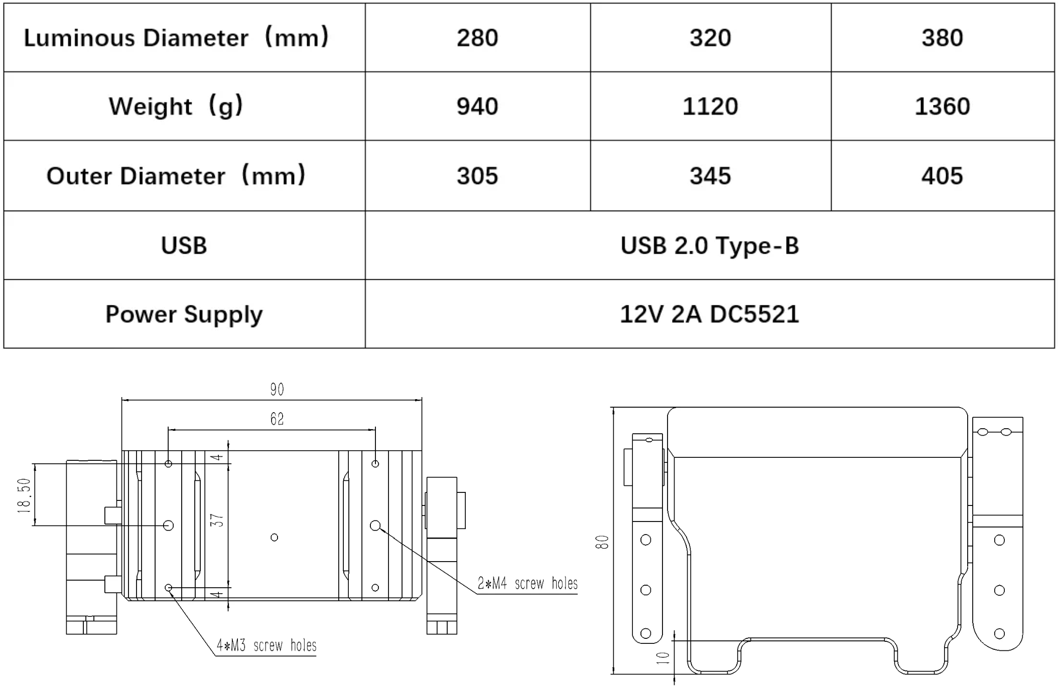 A redesigned wiring system prevents power line damage during repeated operations. The opening angle is customizable up to 270°. M3 and M4 mounting holes allow easy installation on truss telescopes, with custom brackets available.