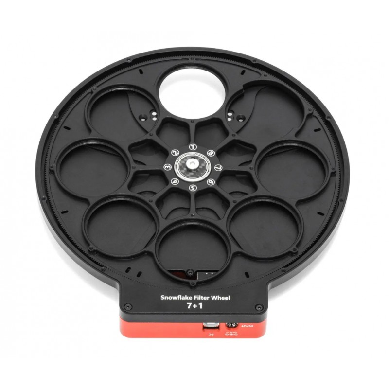 The structure integrates a central mounting screw, increasing rigidity compared to conventional designs. The wheel is compatible with ZWO, QHY, ToupTek, and PlayerOne cameras and off-axis guiders in APS-C and full-frame formats. A dedicated recessed groove allows installation of QHYCCD cameras without increasing back focus.