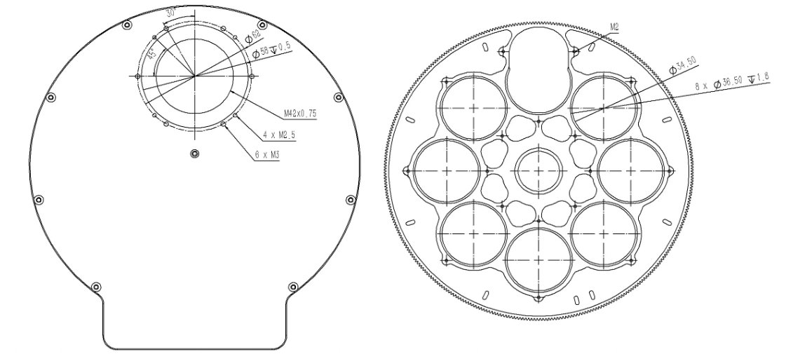 The filter wheel adopts a fully enclosed design, with no exposed motor or electronics. The one-piece filter mask prevents stray light from entering through the sides or openings and reduces the number of screws required to secure the filters, simplifying installation. Conventional filter masks are also included to meet specific requirements, particularly mixed use of unmounted filters and 2-inch filters.