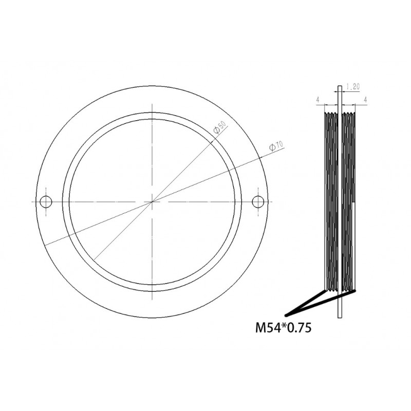 Sa conception compacte limite l’allongement mécanique et préserve le chemin optique. Le diamètre extérieur de 65 mm et l’ouverture claire de 49,6 mm assurent un passage lumineux adapté aux systèmes utilisant le standard M54. Le filetage M54x0.75 est présent de chaque côté pour une compatibilité directe avec les accessoires correspondants.