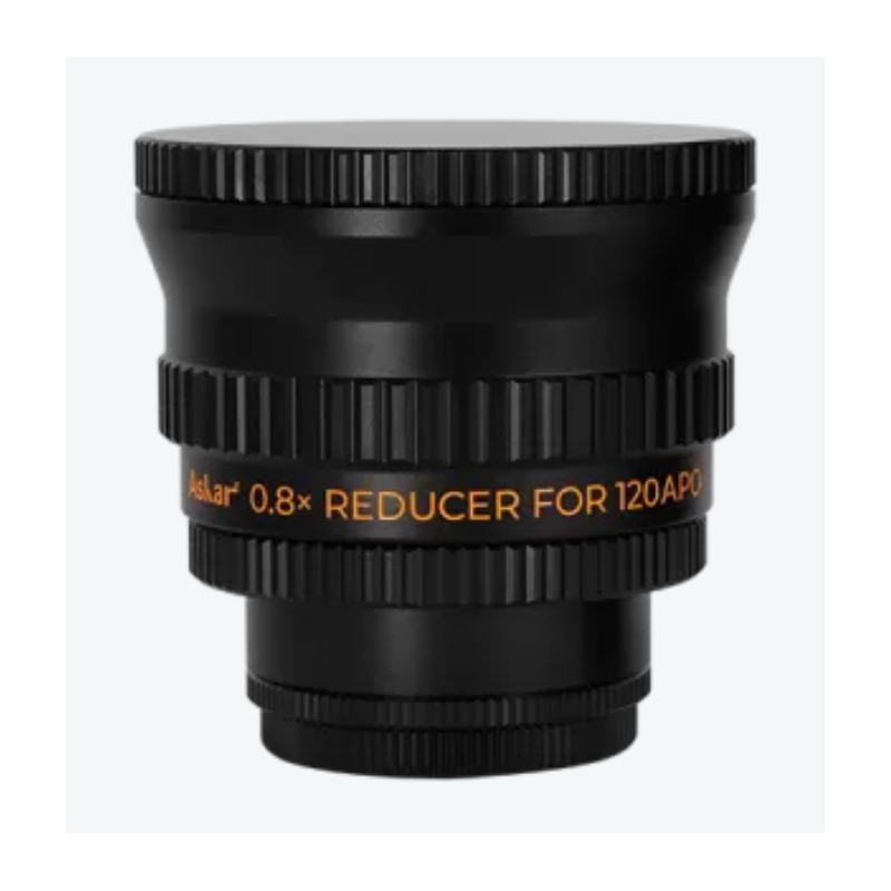 Réducteur optique 0,8x conçu pour la lunette Askar 120APO. Il réduit la focale à 672 mm et le rapport focal à f/5,6 tout en assurant un champ corrigé plein format de 44 mm. Destiné à l’astrophotographie, il permet un champ plus large et des temps de pose raccourcis.