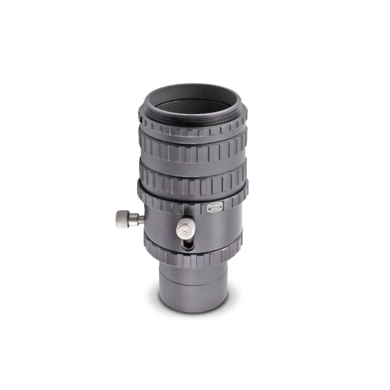 La position axiale de l’oculaire peut être ajustée avec précision par translation à l’intérieur du coulisseau. Cette fonction est essentielle en projection afocale, car l’alignement entre l’oculaire et la lentille frontale de la caméra doit être extrêmement précis. Le système est complété par trois rallonges T-2 (2 × 15 mm et 1 × 7.5 mm), qui enveloppent l’oculaire tout en déterminant la distance entre celui-ci et l’objectif de la caméra. Cette distance est critique pour éviter le vignettage et permettre une mise au point nette dans toutes les zones de l’image.