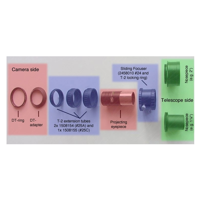 Ce système est livré sans oculaire de projection, sans bague DT et sans adaptateur de filtre. Il constitue une solution de référence pour les astrophotographes utilisant des caméras numériques sans objectif interchangeable, et cherchant une projection rigide, ajustable, et totalement exempte de jeu.