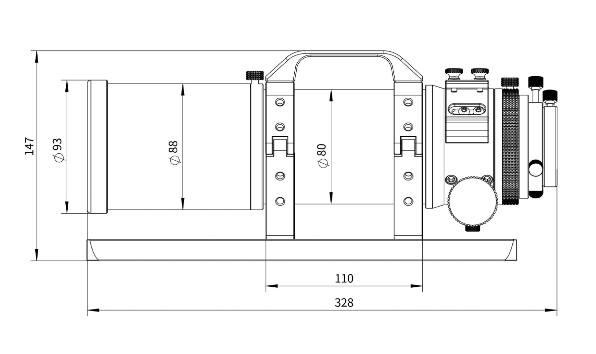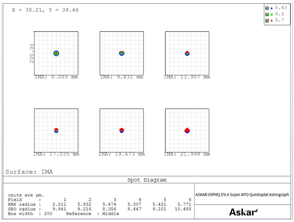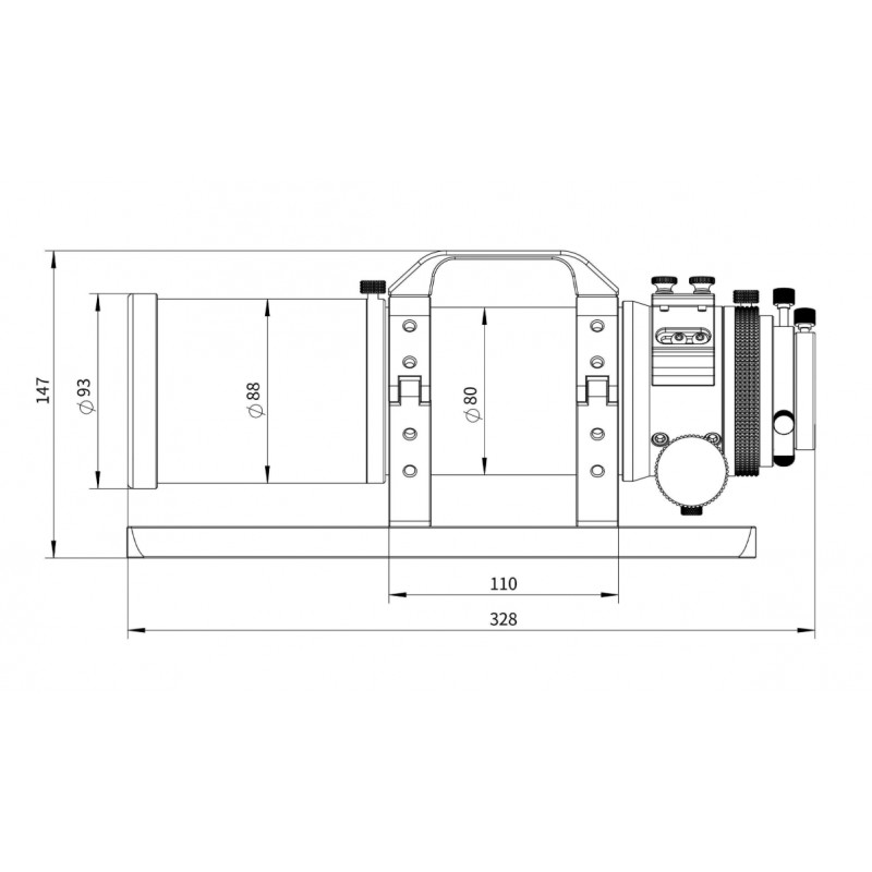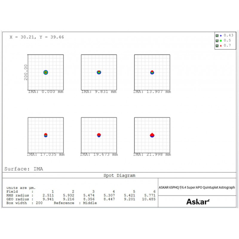 65PHQ est plus compact que les autres astrographes de la série PHQ. Il possède un rapport focal de f/6.4 et une longueur focale de 416 mm. Contrairement aux modèles quadruplets de la gamme, il adopte une conception quintuplet avec deux éléments en verre ED, assurant un excellent contrôle de l’aberration chromatique et des autres aberrations. Grâce à son optique à champ corrigé intégré, il offre de solides performances en astrophotographie, prend en charge le format plein cadre et fournit un diagramme des spots précis avec de très faibles déformations des étoiles périphériques. Il est équipé d’un pare-buée télescopique, d’un tube usiné CNC de haute qualité avec une finition soignée, et de pièces décoratives élégantes. L’OTA pèse 2 kg et l’ensemble complet avec colliers atteint 2,8 kg. Son porte-oculaire rigide de 2,5 pouces inclut un rotateur gradué à 360 degrés et une base pour chercheur. Des adaptateurs caméra M68, M54 et M48 sont fournis, l’adaptateur M48 intégrant un filetage femelle 2 pouces pour recevoir des filtres.