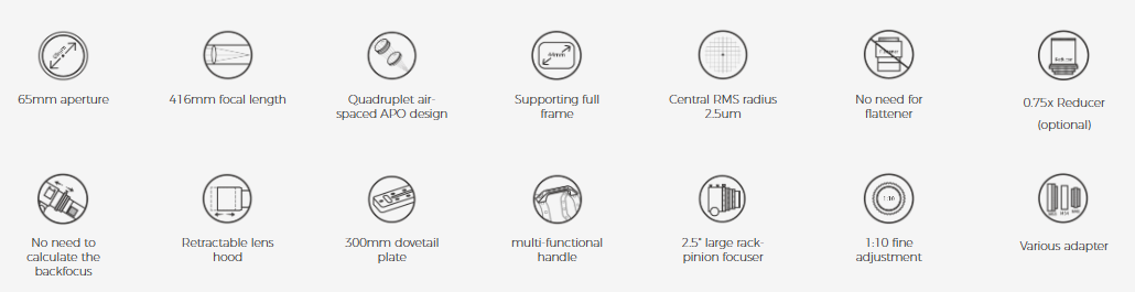 65PHQ est un astrographe à champ plat récemment lancé après les modèles 80PHQ, 107PHQ et 130PHQ. Au lieu d’acheter des correcteurs supplémentaires, de calculer le tirage du correcteur ou de faire des connexions fastidieuses pour obtenir la bonne distance, les astrophotographes peuvent simplement l’équiper de n’importe quel accessoire d’imagerie, mettre la cible au point et l’ensemble du système optique est prêt pour l’imagerie.