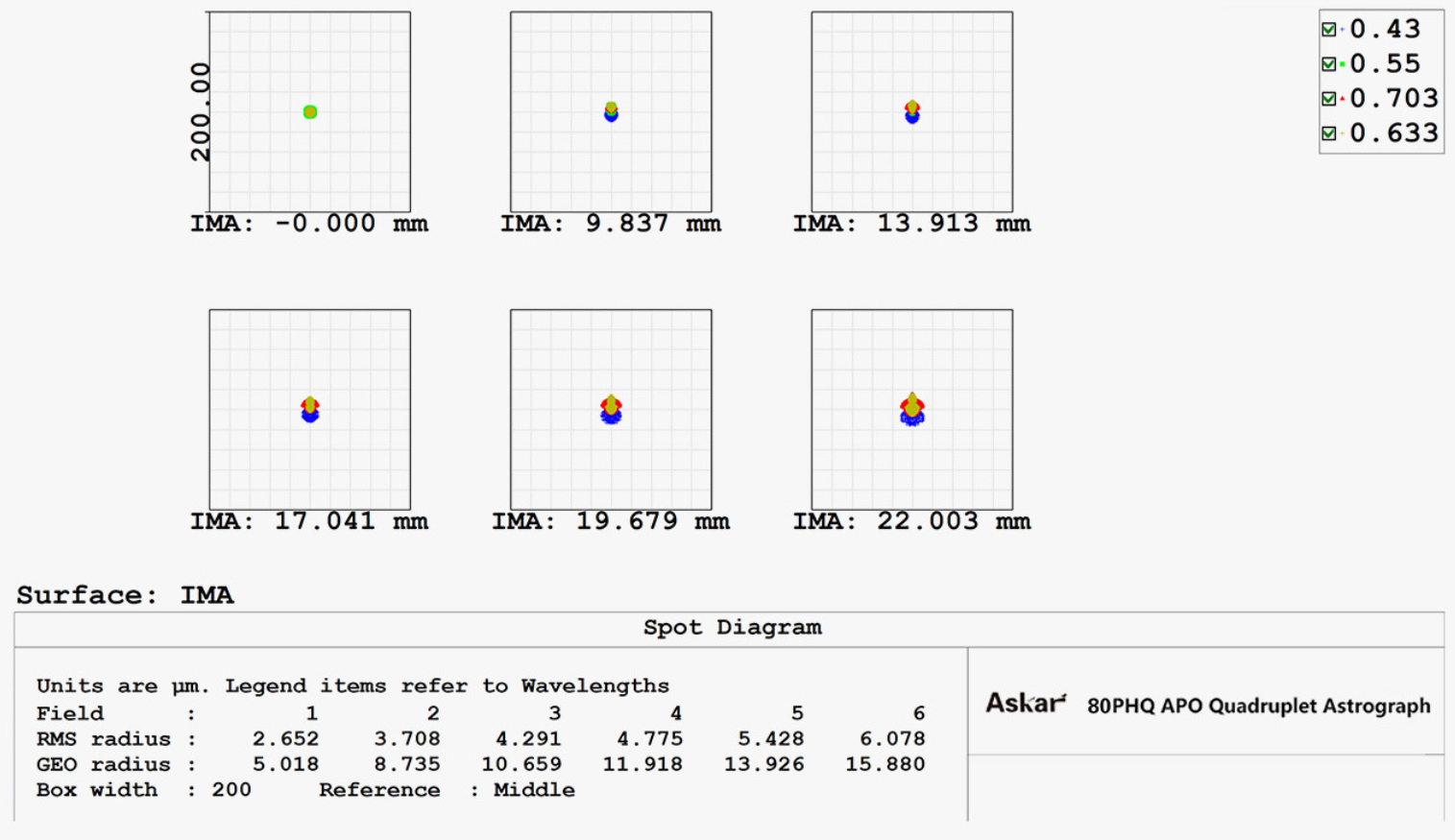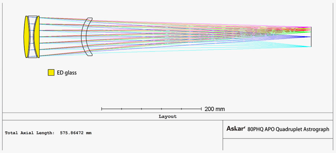 Le 80PHQ reprend la conception optique propre à la série PHQ avec une formule quadruplet 3 plus 1 comprenant deux éléments en verre ED qui réduisent efficacement l’aberration chromatique et améliorent la netteté et le contraste. Les astrographes PHQ utilisent un ensemble optique intégré où chaque lentille participe au système. Cette architecture assure une disposition optimisée des lentilles, un meilleur contrôle du vignettage et une qualité d’image supérieure. Son rapport focal est de f/7.5, ce qui en fait un astrographe à longue focale par rapport aux autres modèles Askar, y compris le 107PHQ qui est à f/7.