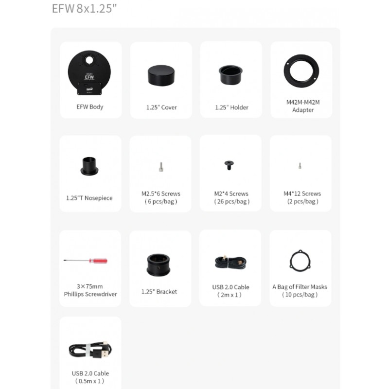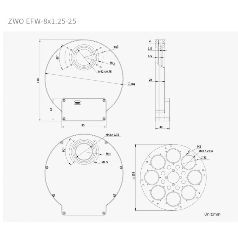 L’EFW 8x31-25 fonctionne sans alimentation externe et est alimentée directement par une connexion USB. Elle consomme 120 mA sous 5 V et se connecte via un port USB-C intégré, à l’aide du câble USB 2.0 Type-A vers Type-C fourni. La compatibilité logicielle annoncée inclut ASIAIR, ASIStudio, ASCOM et le SDK ZWO. Le fonctionnement est de type plug and play, sans installation de pilote.