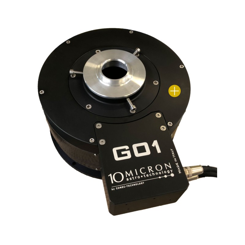 Grâce à une base surbaissée et à une fourche très rigide, la stabilité mécanique est optimisée même dans des dômes de petite taille. L’électronique est entièrement intégrée, avec un microserveur embarqué, un modèle de ciel interne, des fonctions de sécurité avancées (stop d’urgence, protection contre le déséquilibre, limiteurs mécaniques sur les axes) et un système d’équilibrage assisté. Le système est également compatible avec le dérotateur/focuser GO1 (optionnel).