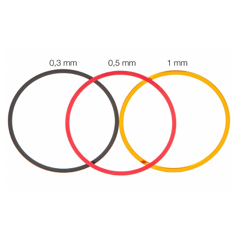 Une correspondance en rotation est fournie à titre indicatif, chaque épaisseur équivalant approximativement à une fraction de rotation du filetage. Une bague de 0.3 mm correspond à environ deux cinquièmes de tour, une bague de 0.5 mm à environ deux tiers de tour et une bague de 1 mm à environ un tour et un tiers. Cette relation permet un ajustement mécanique rapide en complément du réglage optique.