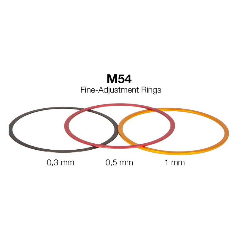 Jeu de bagues Baader Planetarium M54 de réglage fin en aluminium comprenant trois épaisseurs 0.3 mm 0.5 mm et 1 mm. Conçues pour ajuster précisément le tirage dans un système M54 et éviter le blocage des filetages. Solution idéale pour optimiser un montage optique en astrophotographie.