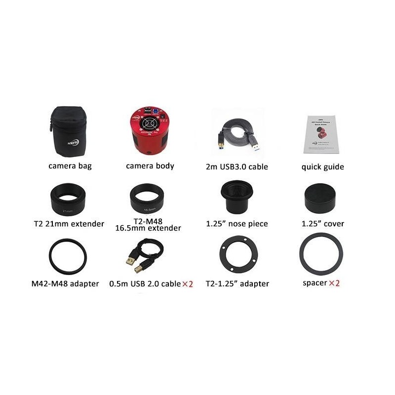 La ZWO ASI294MM Pro est une caméra monochrome refroidie équipée d’un capteur CMOS Sony IMX294 de format 4/3 avec 11,7 millions de pixels. Conçue pour l’astrophotographie du ciel profond à grand champ comme pour l’imagerie planétaire, elle offre un excellent rendement quantique de 90 % et une lecture rapide (jusqu’à 179 images/sec en mode fenêtré). Son capteur rétro-éclairé réduit le bruit électronique, et son système de refroidissement à double étage permet une baisse de température jusqu’à -40°C sous la temperature ambiante, idéale pour les longues poses. Son buffer DDR3 de 256 Mo garantit une transmission fiable des données, même en USB 2.0. La caméra est livrée avec plusieurs bagues d'adaptation, un câble USB 3.0, une sacoche de transport, et nécessite une alimentation 12V pour le refroidissement.