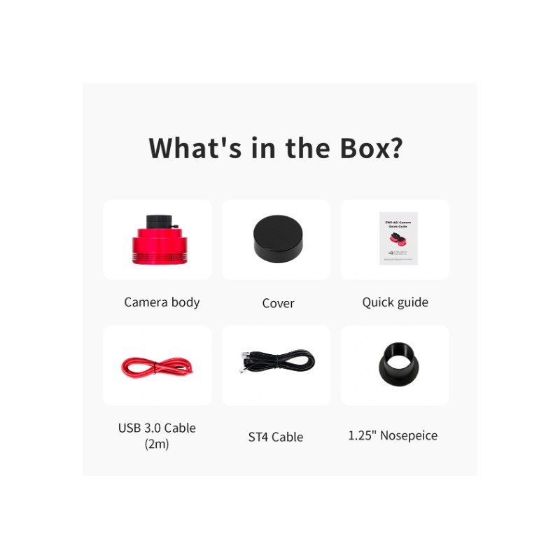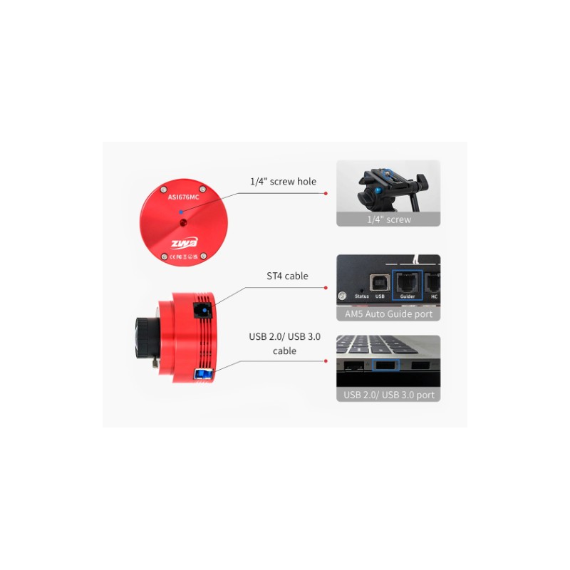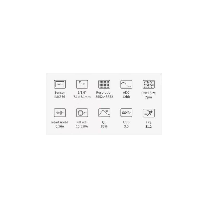 Le capteur rétro-éclairé garantit un rendement quantique de 83 %, un bruit de lecture de seulement 0,56 e⁻ et une capacité de puits de 10,55 ke⁻. La caméra dispose d’un buffer DDR3 de 256 Mo, d’un port USB 3.0 à haut débit, ainsi que d’un port ST4 pour l’autoguidage.