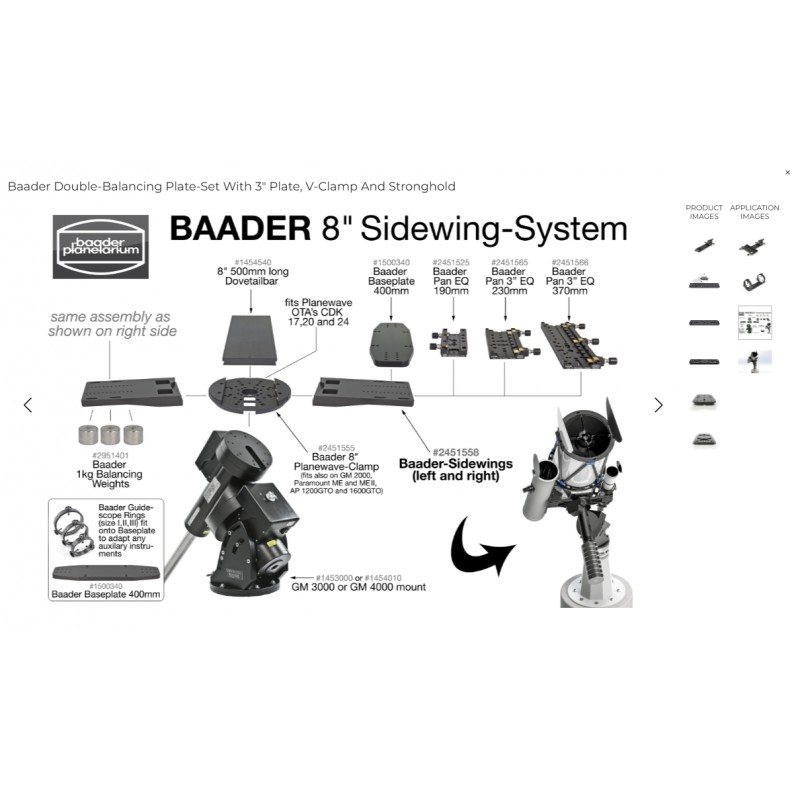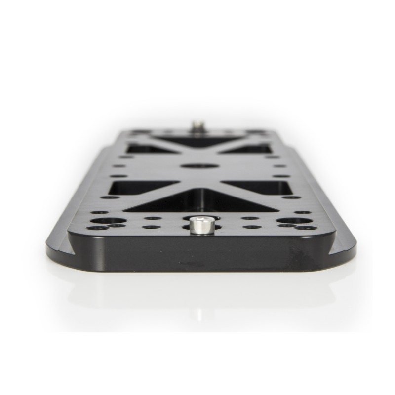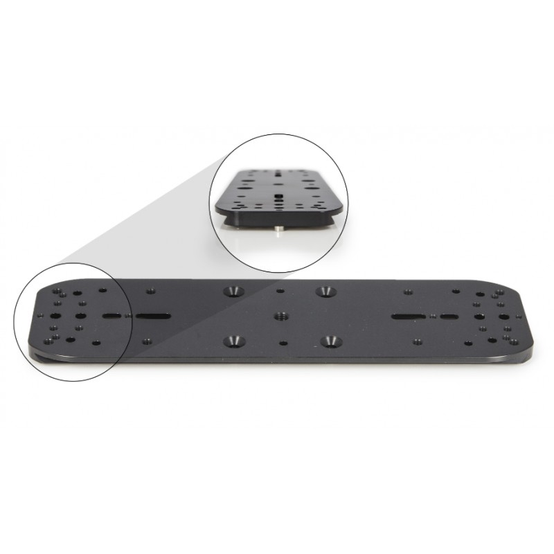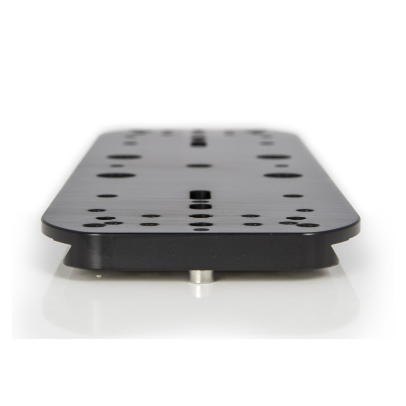 La platine dispose de multiples perçages compatibles avec les montures 10Micron, Astro-Physics, ainsi qu’avec les platines de type AP #1401128 et #1401129. Elle est équipée d’un filetage photo central 3/8" et permet l’ajout ou le remplacement de composants tels que les colliers guides Baader ou d'autres mâchoires de serrage comme les PAN EQ 190/230 mm.