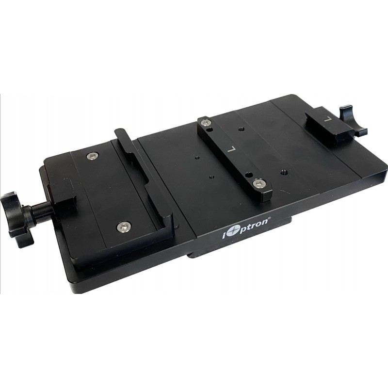 Le système machoire dual universel iOptron est une solution de montage côte à côte usinée CNC, destinée aux astronomes souhaitant utiliser deux instruments simultanément sur une seule monture. Il intègre une platine type Losmandy supportant deux mâchoires distinctes : une mâchoire Vixen réglable et une mâchoire convertible compatible Vixen et Losmandy.
