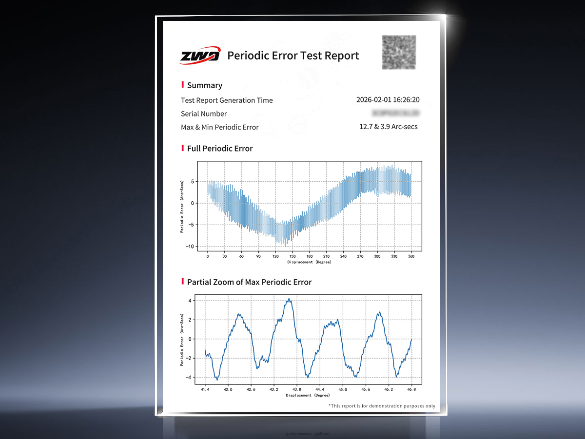 L’erreur périodique est maintenue à ±10 secondes d’arc, et chaque monture est livrée avec son propre rapport de test PE mesuré.