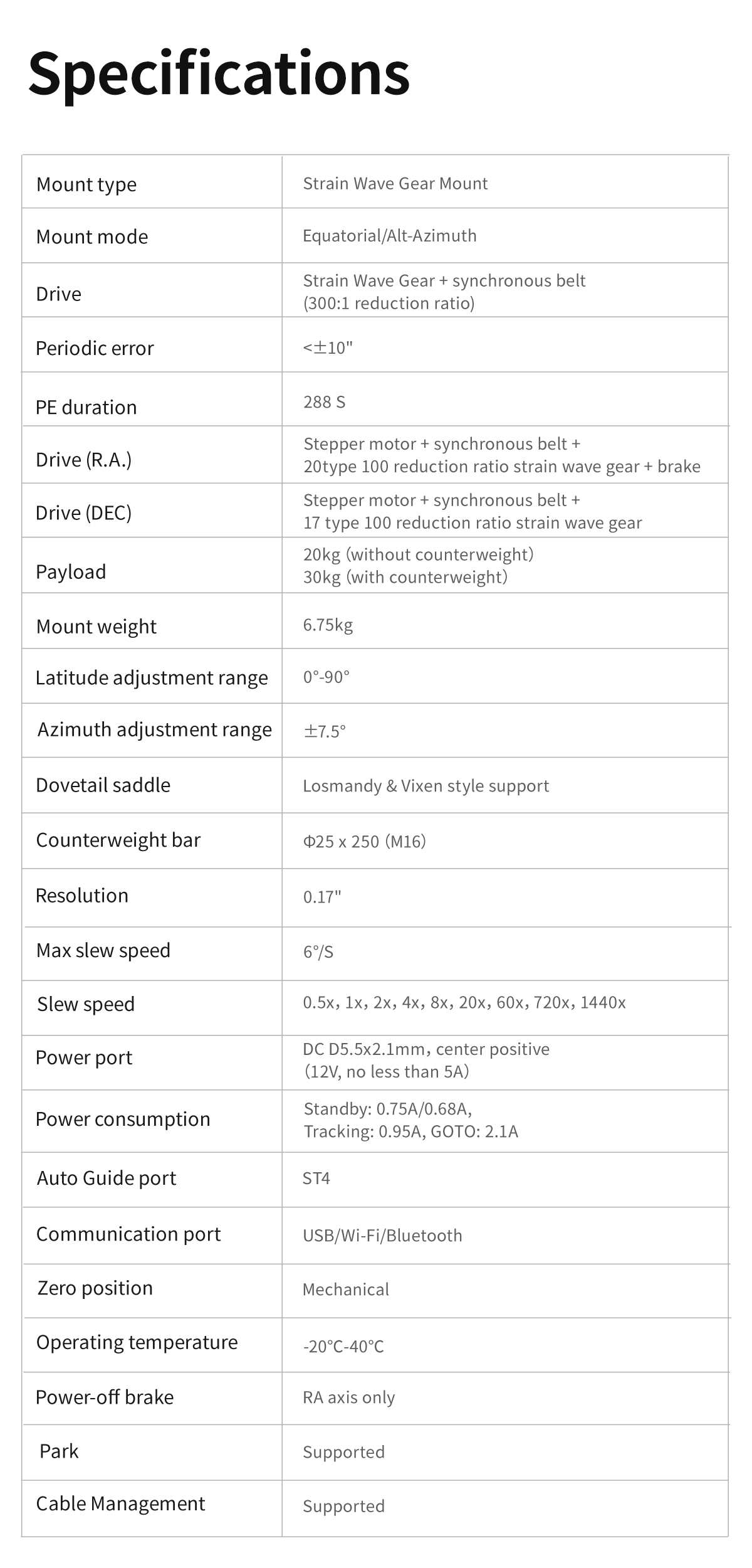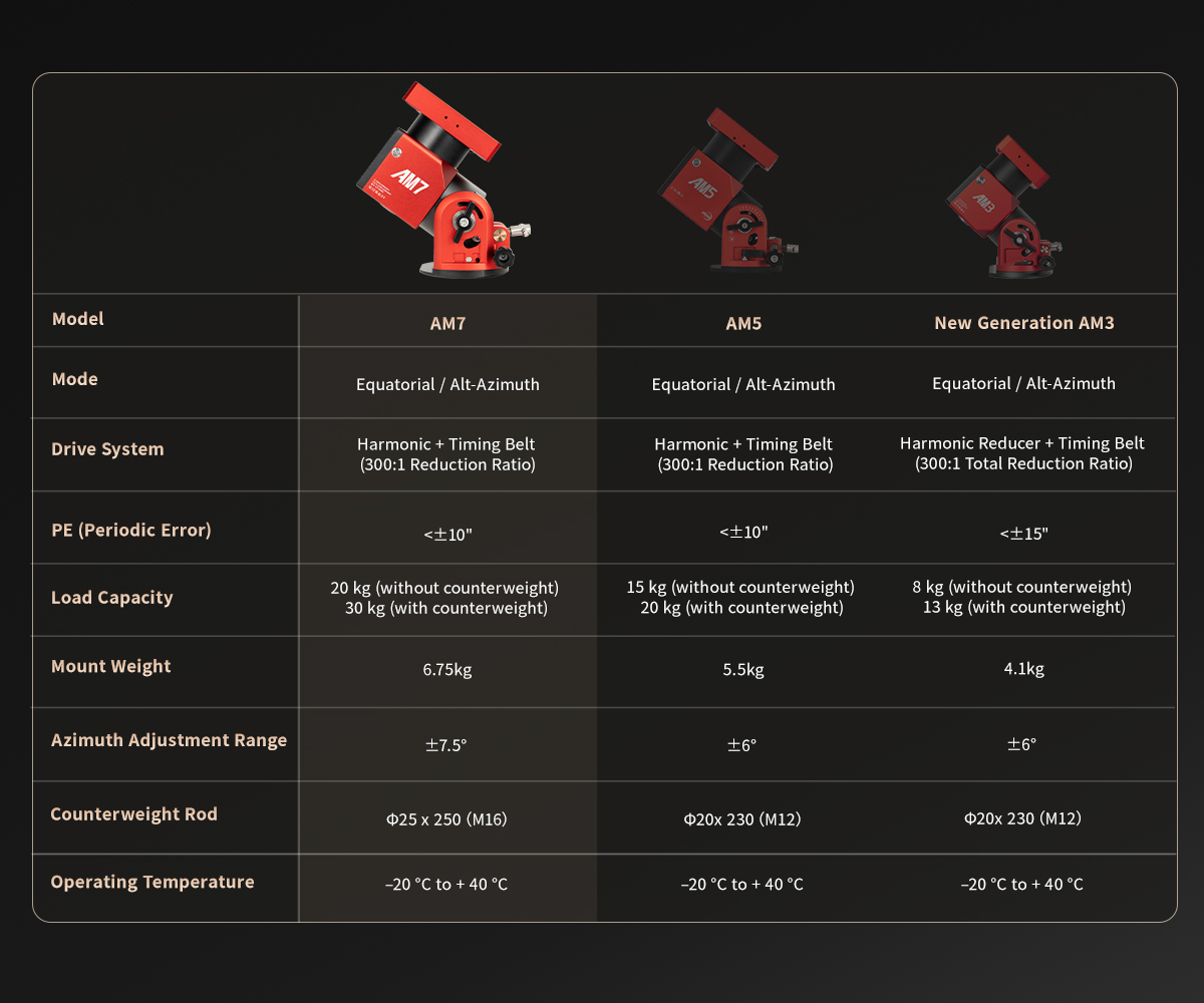 Avec seulement 6.75 kg, une structure optimisée pour la portabilité et un fonctionnement garanti jusqu’à -20°C, la ZWO AM7 constitue une solution haut de gamme pour l’astrophotographe mobile comme pour l’installation fixe avancée.